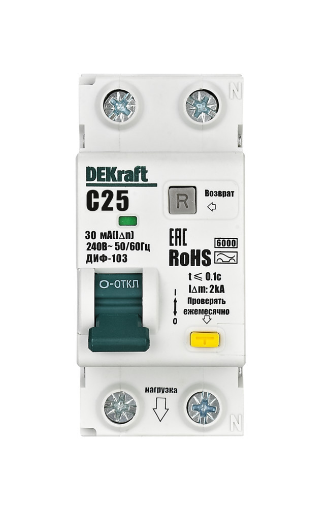 Автоматические выключатели дифференциального тока серии ДИФ-103 6кА NEW Dekraft, 1P+N, номинальный ток 25 А, ном. диф. ток 30 мА, тип диф. расцепителя - AC, кривая отключения - С, Icn, Ics 6 кА, тип устройства - электронный, монтаж – на DIN-рейку. АВДТ обеспечивают три вида защиты — от короткого замыкания, перегрузки и возникновения утечки тока (в частности, вследствие прикосновения человека к токоведущим частям). АВДТ с отключающей способностью 6кА применяются во вводно-распределительных устройствах (ВРУ), главных распределительных щитах (ГРЩ), осветительных и распределительных установках в общественных, административных, производственных, промышленных и других подобных зданиях.