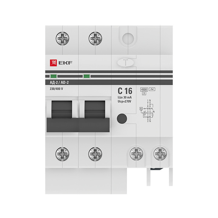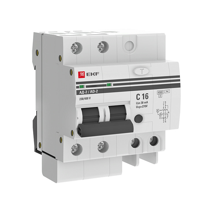 Полное описание товара Выключатель автоматический дифференциальный АД-2 16А/30мА C AC 4.5кА PROxima (EKF) DA2-16-30-pro
