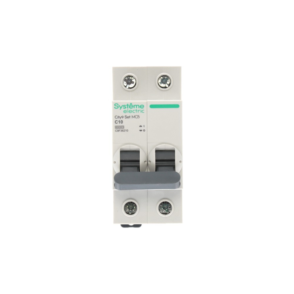 Автоматический выключатель серии City9 Set Systeme Electric, 2-полюсный, номинальный ток 10 А, характеристика С, Icn - 6 кА. Применяется в электрических сетях напряжением 230 В. Предназначен для защиты от перегрузок и токов короткого замыкания. Оснащен механизмом «мгновенной коммутации». Ударопрочный корпус из специального пластика с 6 металлическими заклепками. Безопасные клеммы исключают попадание кабелей в заклеммное пространство.