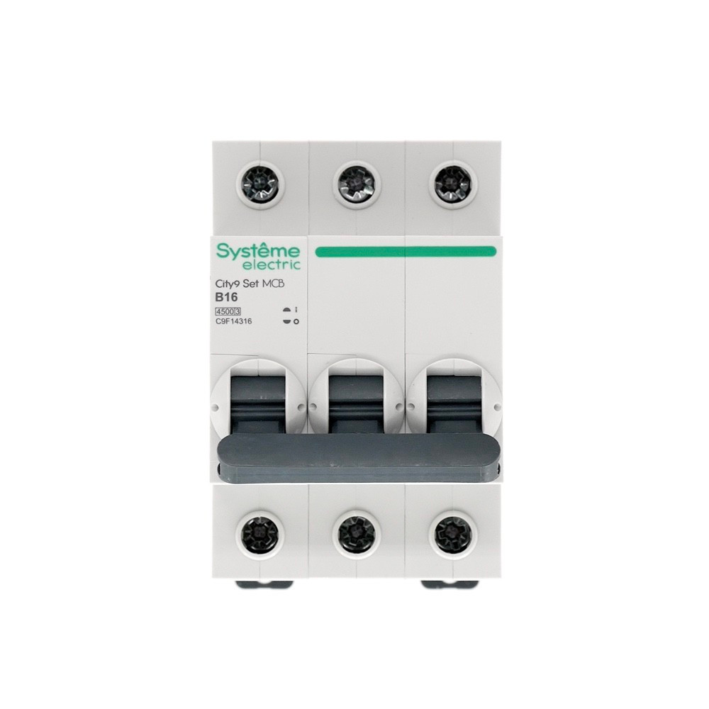Автоматический выключатель серии City9 Set Systeme Electric, 3-полюсный, номинальный ток 16 А, характеристика B, Icn 4.5 кА. Применяется в электрических сетях напряжением 400 В. Предназначен для защиты от перегрузок и токов короткого замыкания. Оснащен механизмом ''мгновенной коммутации''. Ударопрочный корпус из специального пластика с 6 металлическими заклепками. Безопасные клеммы исключают попадание кабелей в заклеммное пространство.