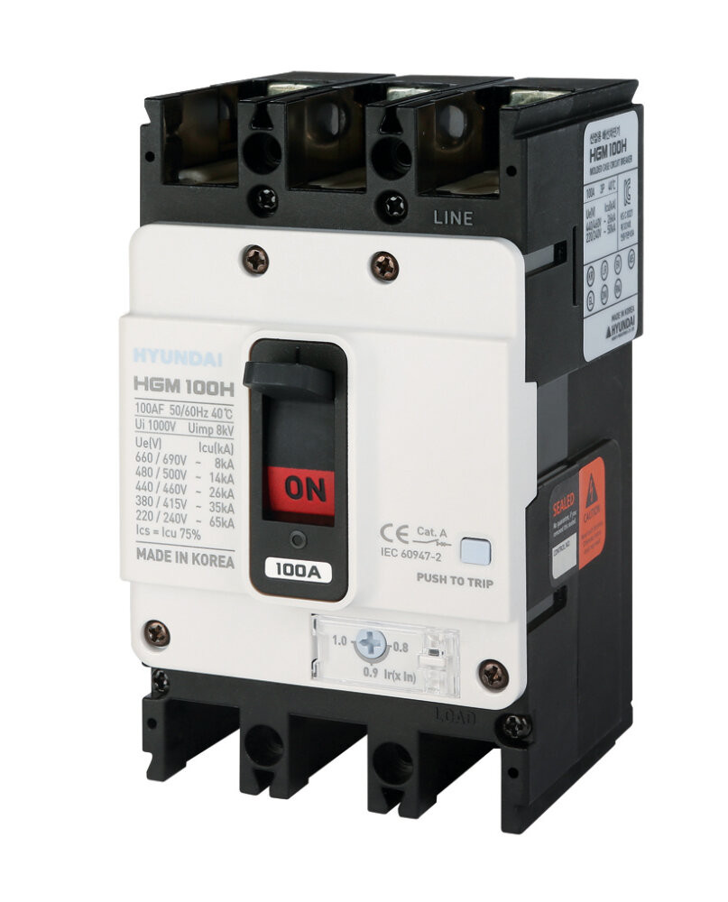 Выключатель автоматический в литом корпусе типа HGM, типоразмера 100AF, арт.HGM100H3PT4S0000C00100F (100А, 26кА, 3 полюса, регулируемый термомагнитный расцепитель, переднее подключение) (HD Hyundai Electric) 3647629