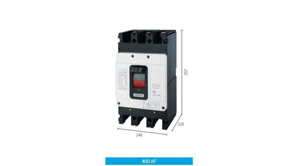 Полное описание товара Выключатель автоматический в литом корпусе типа HGM, типоразмера 400AF, арт.HGM400E3PT4S0000C00400F (400А, 38кА, 3 полюса, регулируемый термомагнитный расцепитель, переднее подключение) (HD Hyundai Electric)