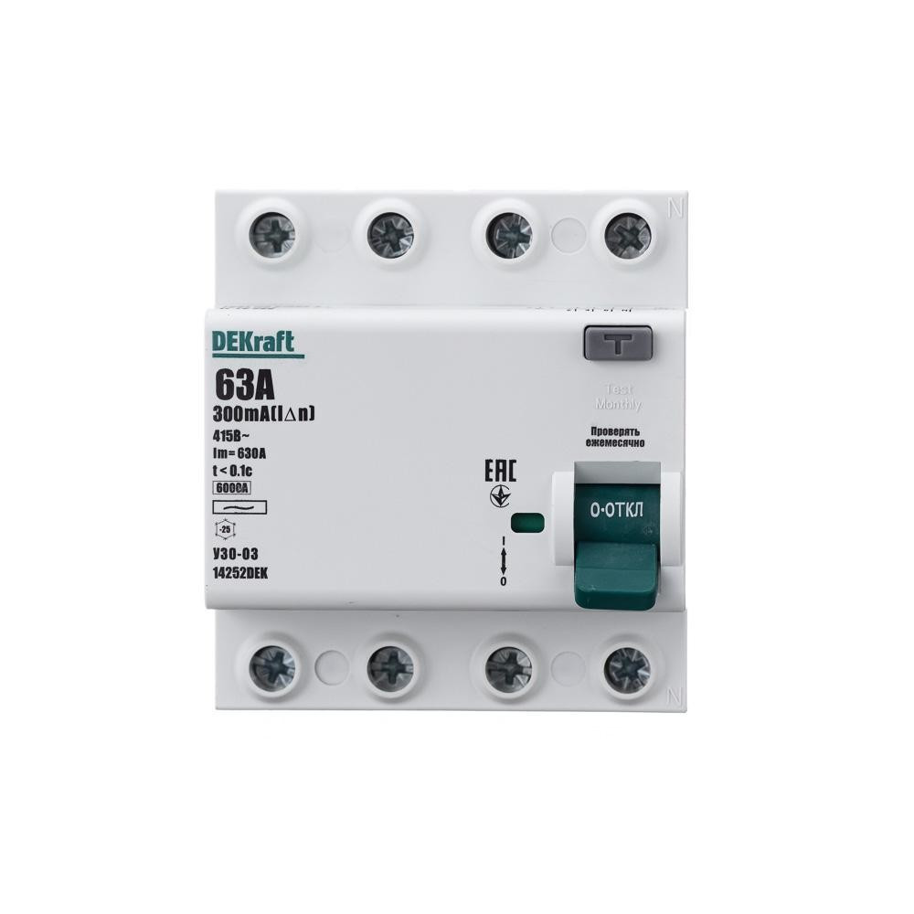 Выключатель дифференциального тока (ВДТ) серии УЗО-03 Dekraft, 4P, номинальный ток 63А, номинальный дифференциальный ток 300 мА, блок дифференциальной защиты – электромеханический, тип дифференциального расцепителя - AC, ширина – 2 мод. х 18 мм, монтаж – на 35 мм DIN-рейку. Уставка тока утечки 300 мА обеспечивает защиты людей от поражения электрическим током при косвенном прикосновении, сборки от возгорания из-за тока утечки. Электромеханический выключатель дифференциального тока (ВДТ) разомкнет цепь даже при повреждении «нулевого» провода либо значительном падении напряжения. При сборке выключатель дифференциального тока (ВДТ) и автоматический выключатель (ВА) для его защиты устанавливаются последовательно, номинальный ток УЗО-03 NEW 6кА должен быть равен номинальному току автоматического выключателя (ВА).