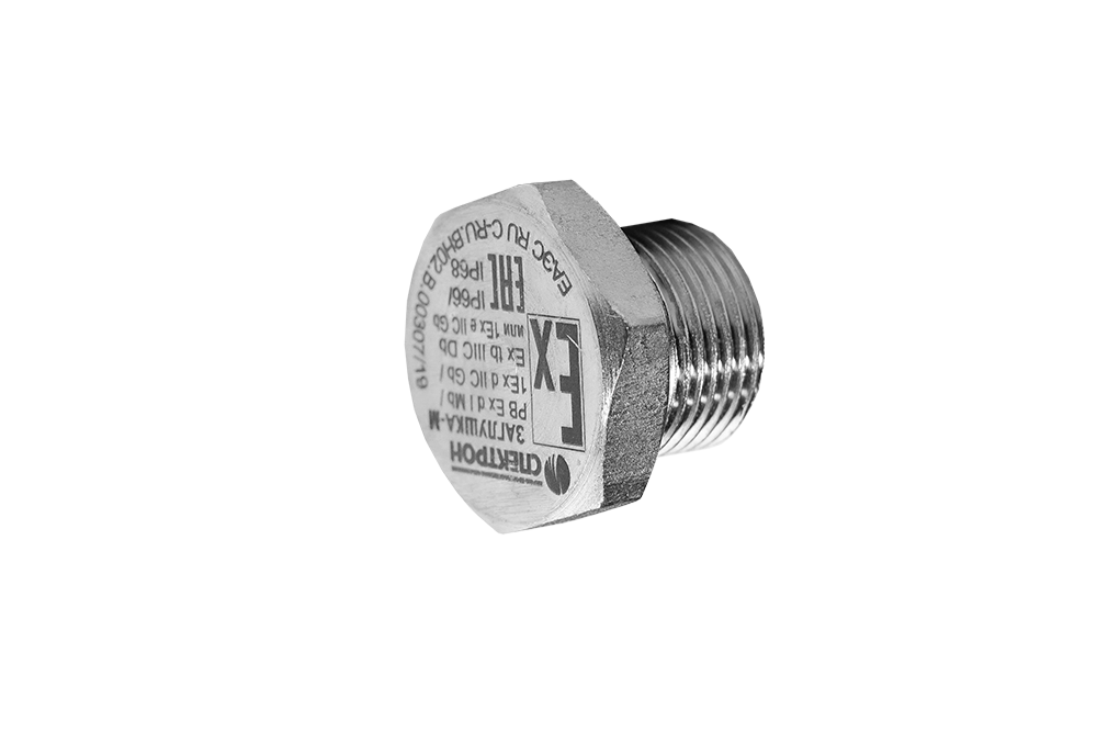Заглушка-М - оконечная заглушка размером М20*1,5. Индекс (М) - исполнение из стали Ст10-20. Предназначена для герметизации не используемого отверстия в взрывозащищенном оборудовании.