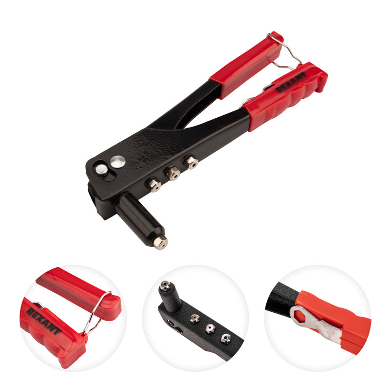 - Преимущества: При изготовлении корпуса использовалась конструкционная сталь|Резиновые накладки на рукоятках предусмотрены для удобной работы|Использован механизм, позволяющий снизить усилие на рукоятях|Специальная скоба на конце рукояток упрощает хранение заклёпочника|Оснащен насадками 4-х разных диаметров
