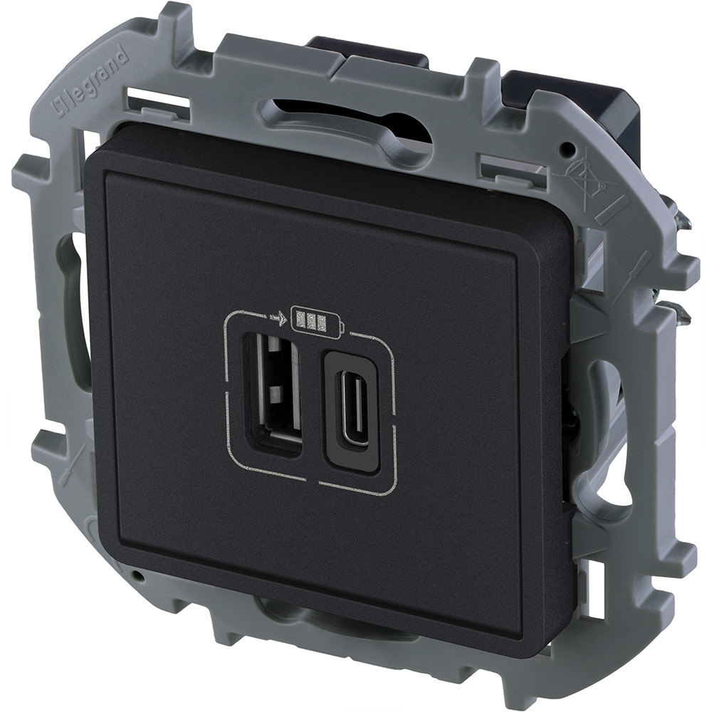 Зарядное устройство Inspiria для скрытого монтажа , тип А-тип С, цвет ''Антрацит''. Напряжение ~240В/-5В, максимальный зарядный ток 3000 мА. Применяется для непосредственной зарядки одного или двух мобильных устройств.