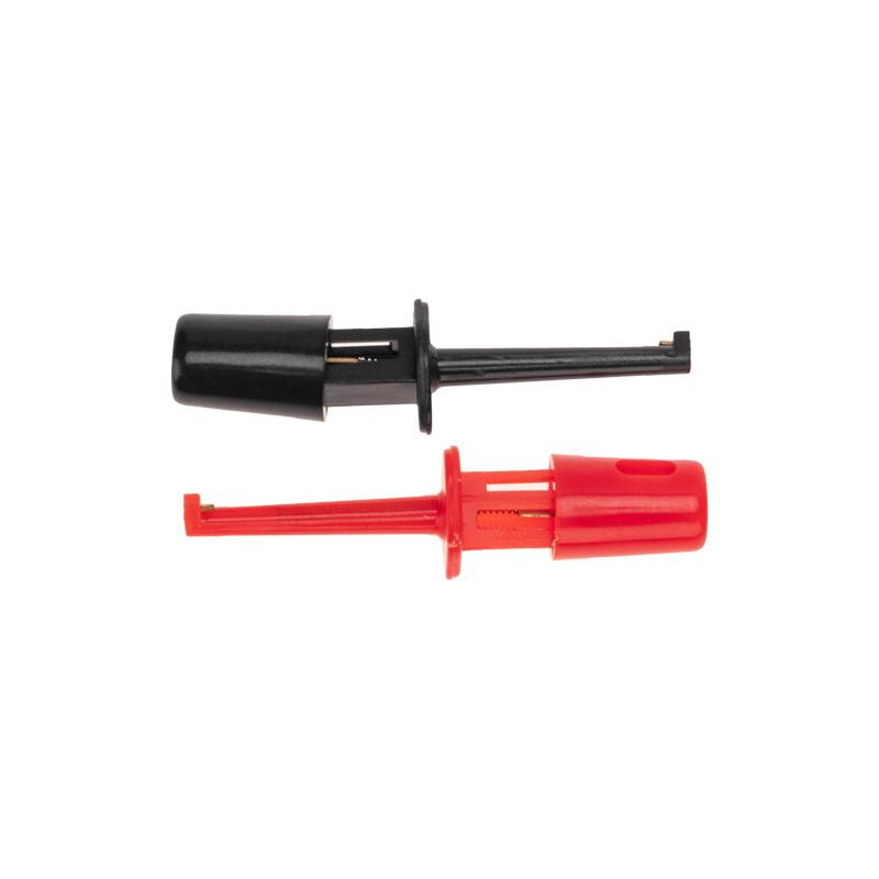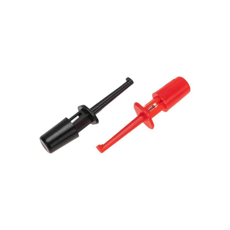 Зажим для тестера предназначен для работы с электронными компонентами на плате. Представляет собой щуп для мультиметра в виде подпружиненного мини-крючка в пластиковом корпусе. Крючок монтируется на провод с помощью пайки (пластина для пайки скрыта за колпачком). Конструкция зажима позволяет зацепиться за выводы и не держать щупы руками во время проведения измерений. Пластиковый корпус изделия предотвращает возможность короткого замыкания. Длина зажима в корпусе – 40 мм. В упаковке поставляется 2 зажима (1 красный и 1 черный).