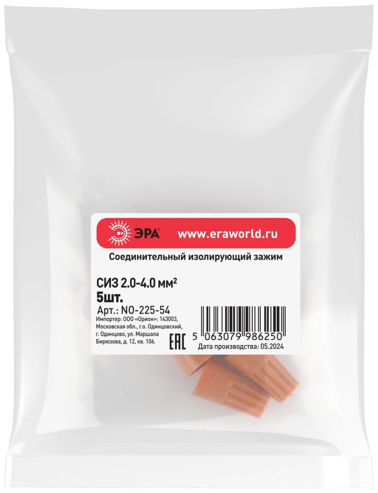 Полное описание товара Зажим изолирующий соединительный NO-225-54 СИЗ-3 (2,0-4,0 мм2) оранжевый (упак. 5 шт.) (ЭРА) Б0063378