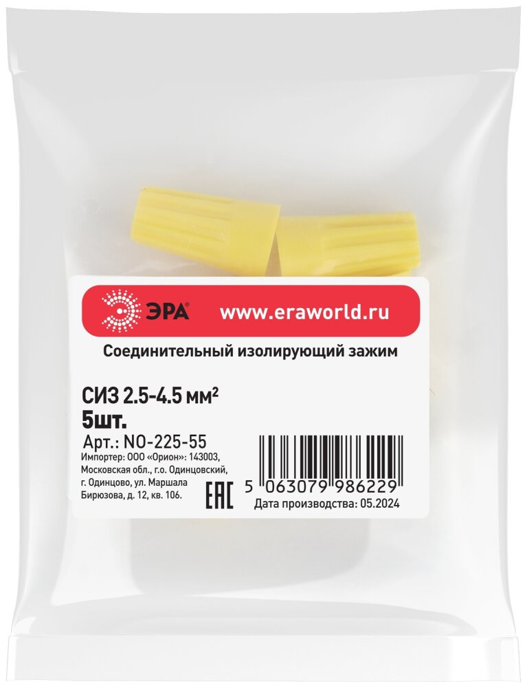 Полное описание товара Зажим изолирующий соединительный NO-225-55 СИЗ-4 (2,5-4,5 мм2) жёлтый (упак. 5 шт.) (ЭРА) Б0063380