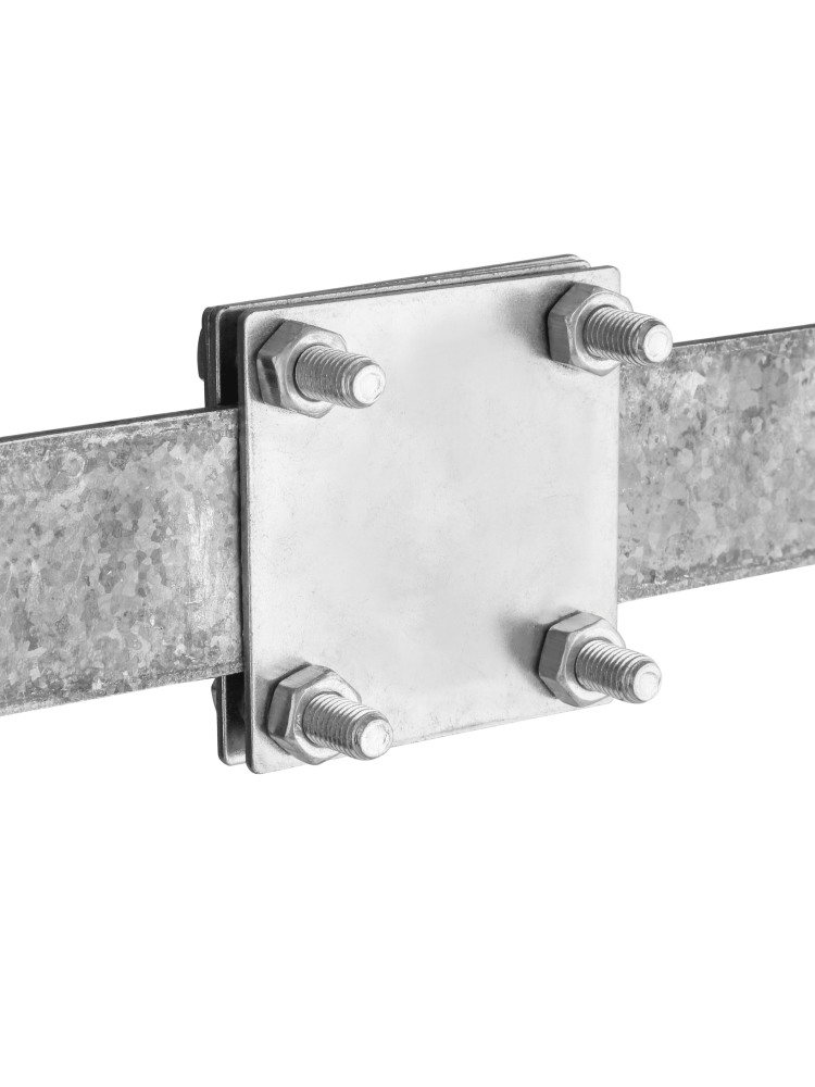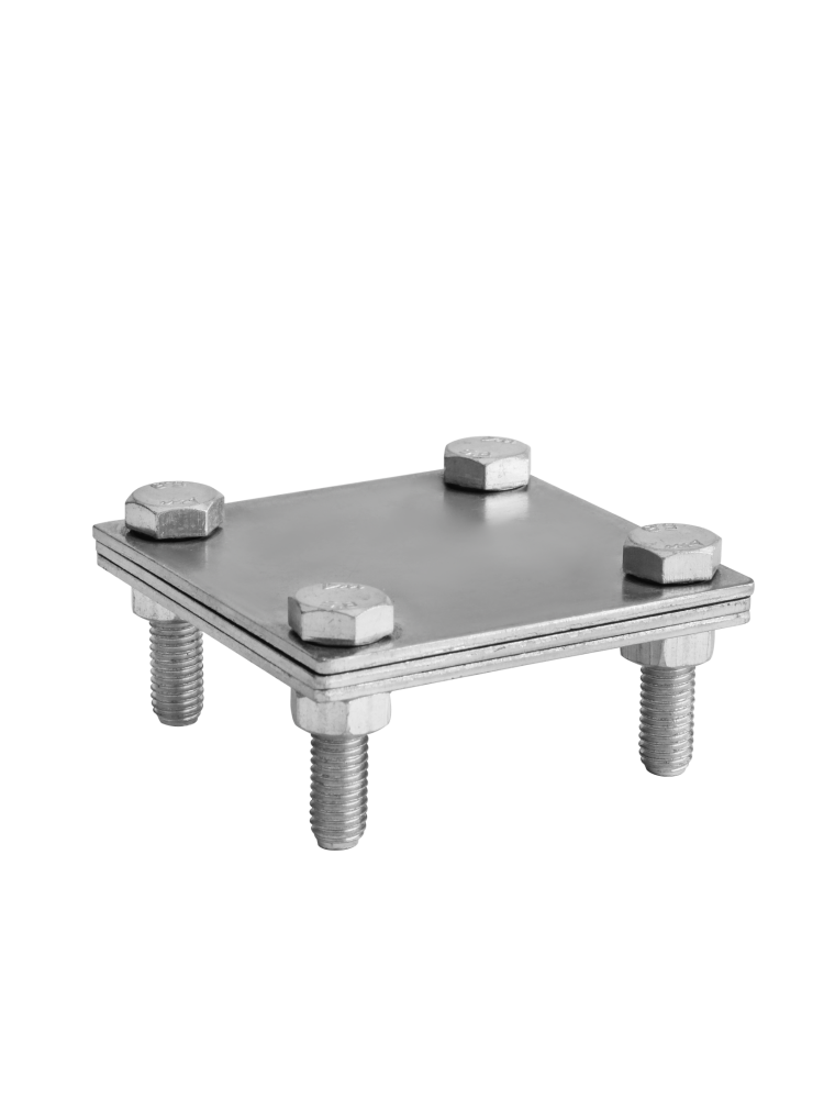 Зажим заземления полоса-полоса крестообразный выполнен из оцинкованной стали и используется для соединения полосы с полосой Т-образным либо параллельным способом. Зажим стягивается при помощи четырех шестигранных болтов с гайками с резьбой.
