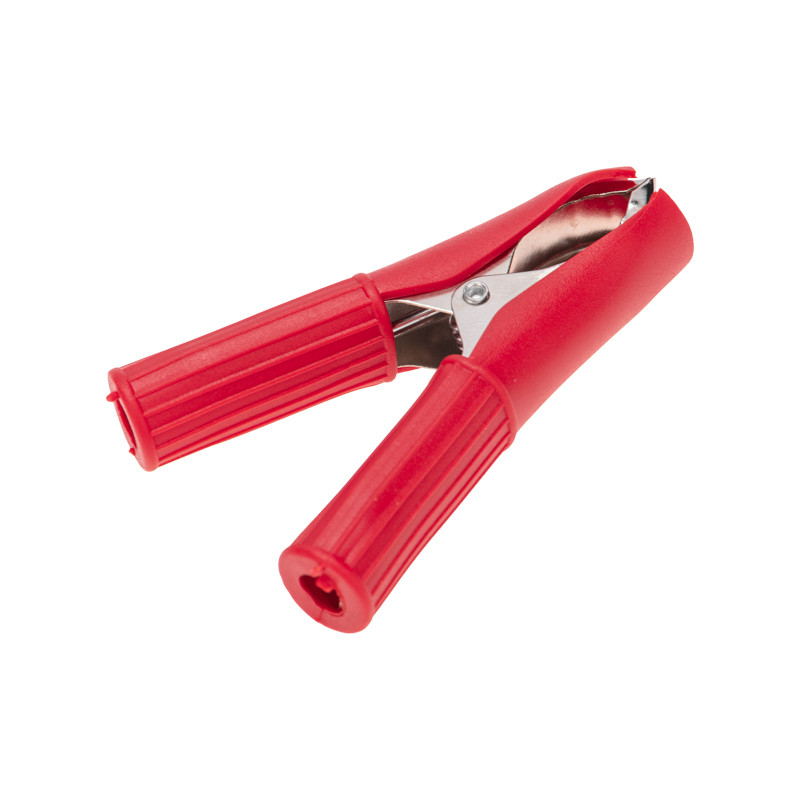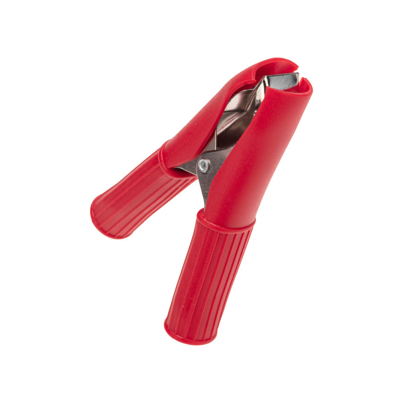Зажим 'крокодил' 30А 75 мм в изоляторе представляет собой электромеханическое устройство, предназначенное для оперативного соединения или разъединения контакта проводов при выполнении измерительных работ или монтажа электрических и слаботочных сетей. Зажим получил свое название за схожесть с челюстями крокодила. Состоит он из двух фигурных деталей с 'крокодильими' зубцами, скрепленных серединами специальным штифтом и способных поворачиваться на некоторый угол вокруг оси соединения. К одной из деталей монтируется контактный провод. Сжатие 'челюстей' обеспечивается пружиной, вставленной с другой стороны штифта. Контактная часть изделия изготавливается из стали с никелированным покрытием и полностью закрыта изолятором.