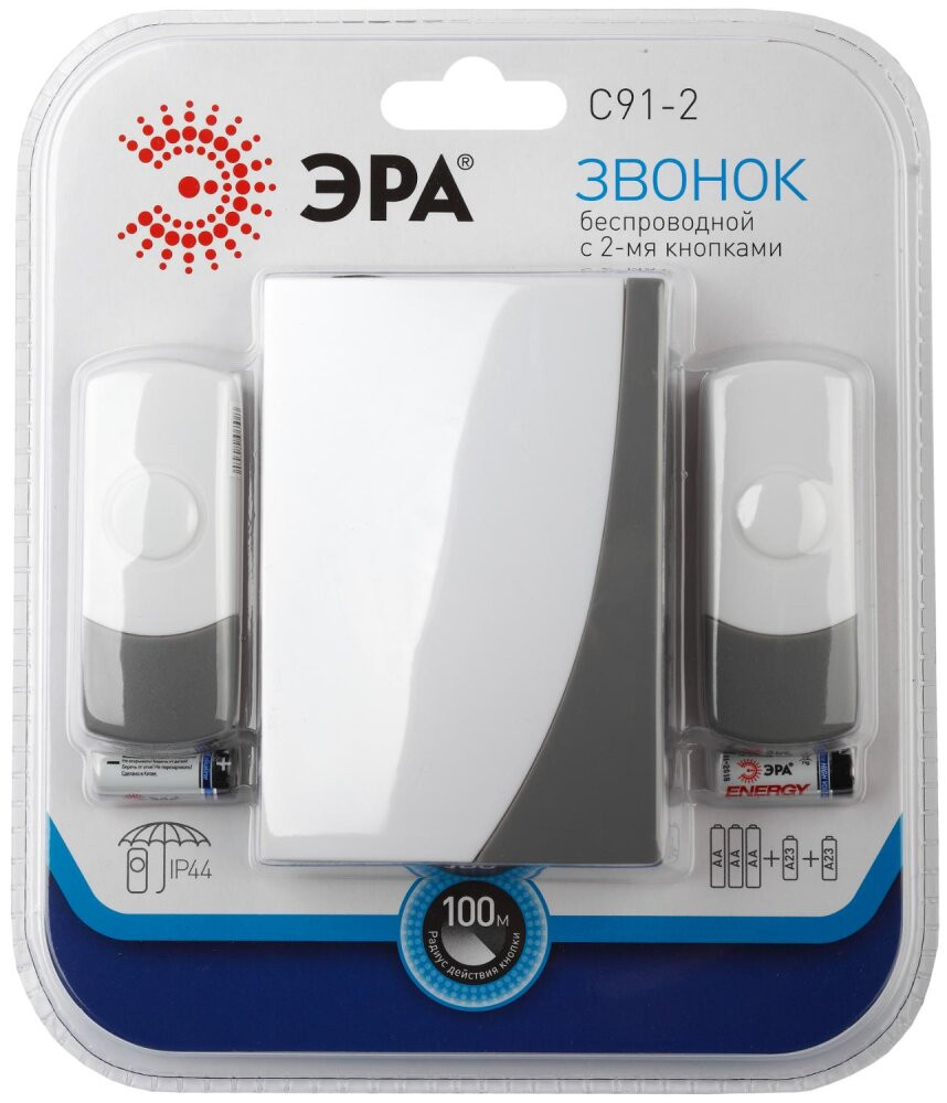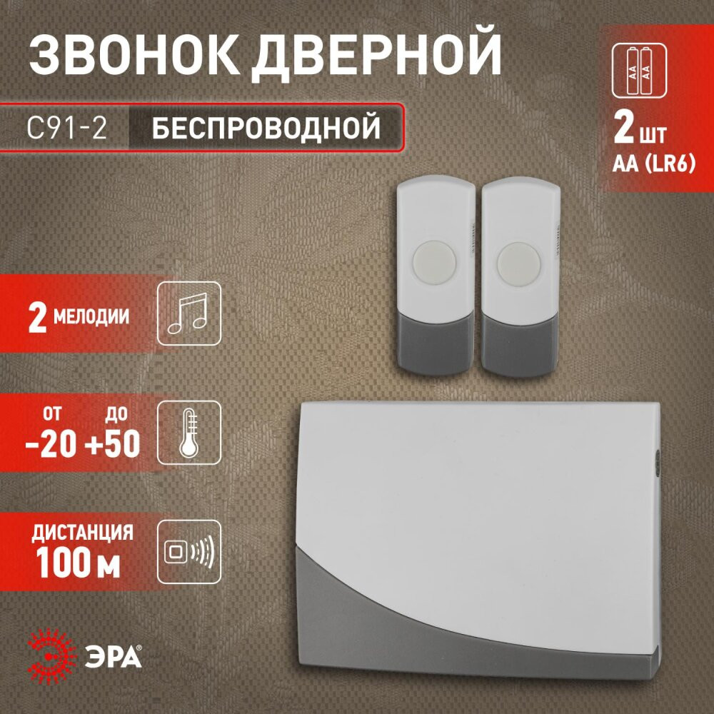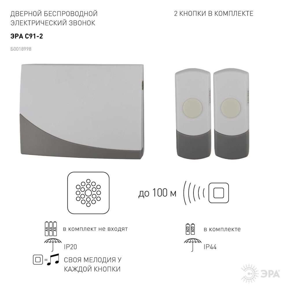 Полное описание товара Звонок дверной беспроводной на батарейках 2 мелодии-отдельно для каждой кнопки 100м IP44 бело-серый 3АА/А23 C91-2 (ЭРА) Б0018998