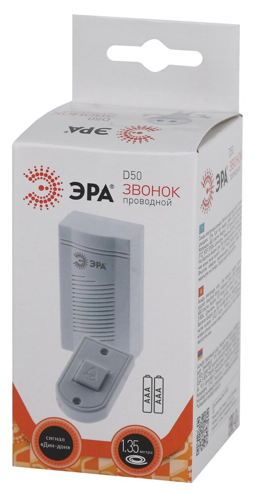 ЭРА D50 - проводной электрозвонок с полифонической мелодией. Динамик работает от 2 мизинчиковых батареек (2 х ААА) и отличается оптимальной громкостью. Длина провода, соединяющего кнопку и динамик - 1,35 м. Корпус изготовлен из легкого прочного пластика базового белого цвета. Электрозвонок ЭРА универсален для любого интерьера. Прост в установке и удобен в использовании.