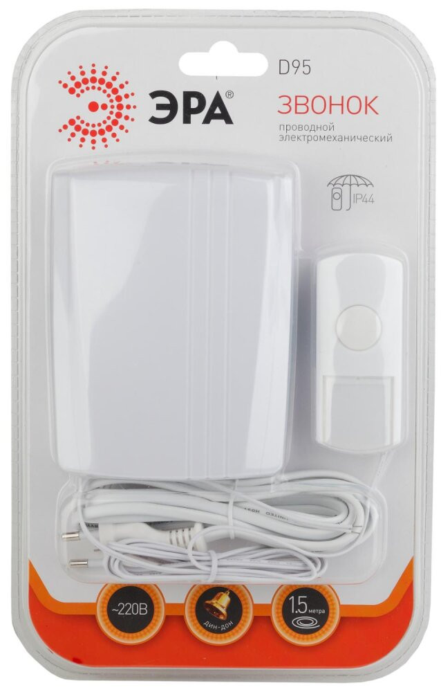 D95 ЭРА – дверной проводной электронный звонок с влагозащищённой кнопкой. Звонок ЭРА позволяет производить звуковое оповещение на расстоянии. Передача сигнала о нажатии кнопки происходит с помощью проводов. Степень защиты динамика - IP20, степень защиты кнопки - IP44. Имеет элегантный корпус, который отлично смотрится в любом интерьере. Устройство звенит классической мелодией дин-дон. Регулировки громкости нет. Универсальный белый цвет, аккуратный внешний вид. Удобный надёжный вариант с сетевым шнуром 1,5 метра.