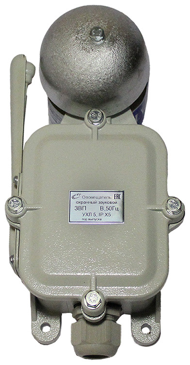 Оповещатель охранный звуковой ЗВП предназначен для подачи мощного одиночного звукового сигнала, продолжительностью не более 1 минуты. Электрический звонок ЗВП применяется в системах оповещения административных и промышленных зданий, а также во многих других схемах электрических цепей переменного тока. Корпус оповещателя ЗВП изготовлен из алюминиевого сплава и обеспечивает надежную защиту электромагнитного механизма от проникновения влаги. Оповещатель ЗВП устойчиво работает при колебаниях напряжения переменного тока в пределах плюс-минус 10% и колебания частоты в пределах плюс-минус 2%.